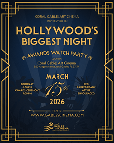 Step onto the red carpet and join us for a glamorous evening celebrating 97 years of cinematic excellence—cheer, gasp, and toast as the winners of this year’s golden statuettes are revealed! Pre-Show Admission / Walk the Red Carpet and Take Your Photos | 6:00 PM Awards Ceremony Begins | 7:00 PM Tickets: $75 for Coral Gables Art Cinema and Coral Gables Chamber of Commerce Members $100 General Admission $125 for Two Tickets Your ticket includes: A delicious spread of gourmet bites, featuring both savory and sweet delights to fuel your Oscar night. Unlimited adult beverages to keep the party rolling all night long (cheers to the winners!) Oscar trivia with amazing prizes! Test your movie knowledge and win fabulous prizes throughout the night. Awards attire encouraged, but feel free to channel your favorite movie character or go bold with a creative Hollywood-inspired look. The best dressed will be awarded a special prize, so bring your A-game.